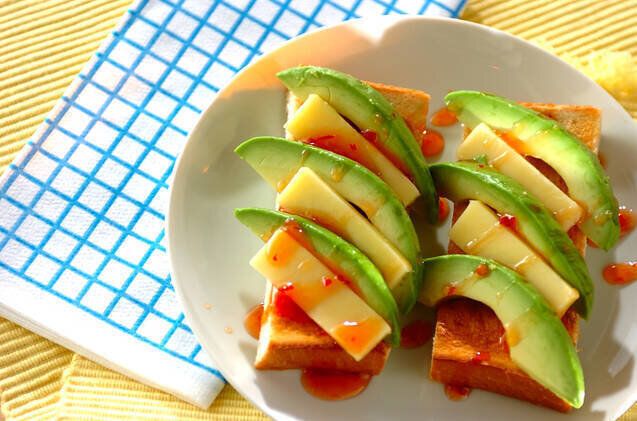アボカドとチェダーチーズを具材にした、おしゃれなオープンサンドレシピ。アボカドのまったり感に、甘辛いスイートチリソースがよく合います。カリッと焼いた食パンと、具材の食感の違いも楽しいですよ。