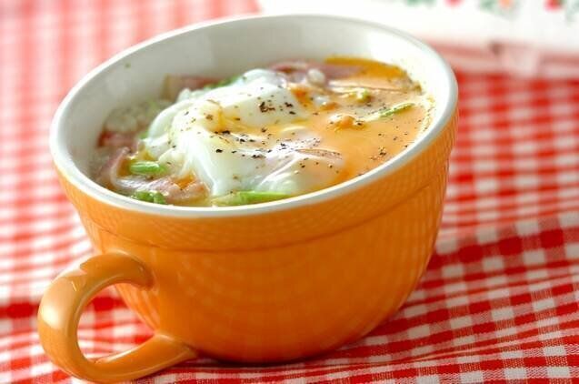 マグカップ1個でご飯・野菜・卵を一度に食べられる、半熟卵のカルボナーラごはん。市販のクリームスープの素と電子レンジを使って、7分ほどでつくれるお手軽さもいいですね。ご飯にからむ濃厚な味わいがたまりません。