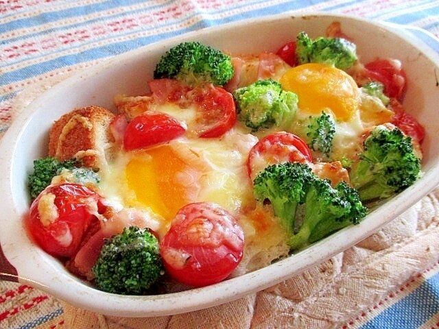 パン・卵・野菜を同時に食べられる、野菜と卵のココット。手が込んでいるように見えるのに、電子レンジとトースターだけでつくることができます。この一皿で、カフェのような豪華な朝ごはんに♪