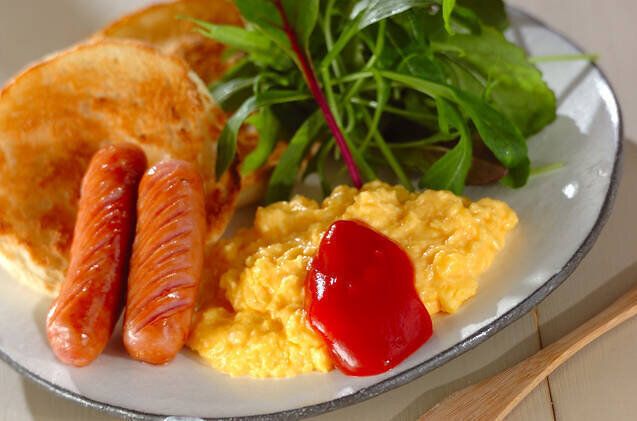 マヨネーズを加えることで、冷めてもやわらかく、ホテルの朝食のような味わいに仕上げるレシピです。イングリッシュマフィンやソーセージなどを添えて、華やかに。ケチャップなしでシンプルに味わうのも美味しそうですね。