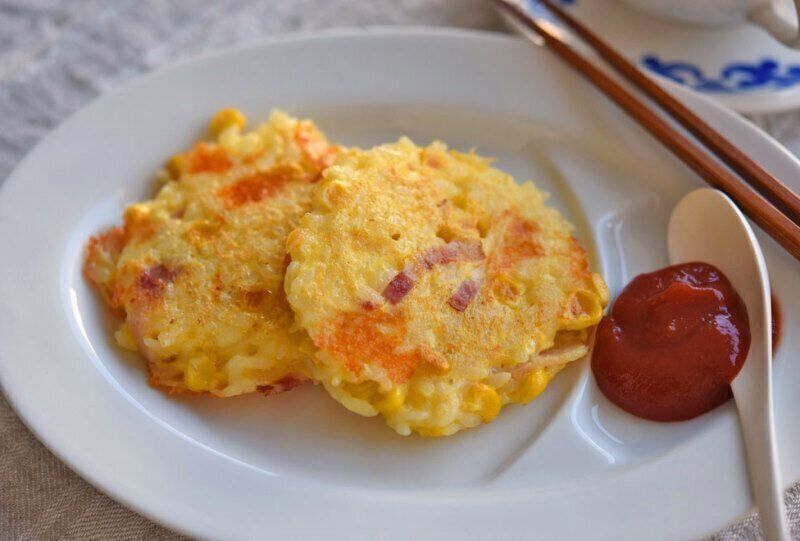 ご飯に卵・コーン・ベーコンなどを混ぜて焼いた、コクのある卵ご飯焼き。小さめサイズで焼くことで、いそがしい朝でも手軽に食べやすくなります。相性のいいケチャップやコーヒーを添えて楽しみましょう!
