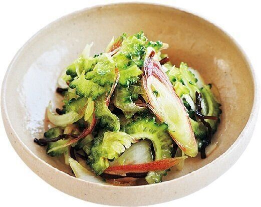 玉ねぎ1/2個は薄切りにして、5分ほど水にさらす。ゴーヤー1本は縦半分に切り、種とわたを取り、薄切りにする。みょうが3本は薄切りにする。全部混ぜ合わせ、塩昆布ふたつまみを加えてさらに混ぜ、ごま油大さじ1を加えてあえたら完成。
