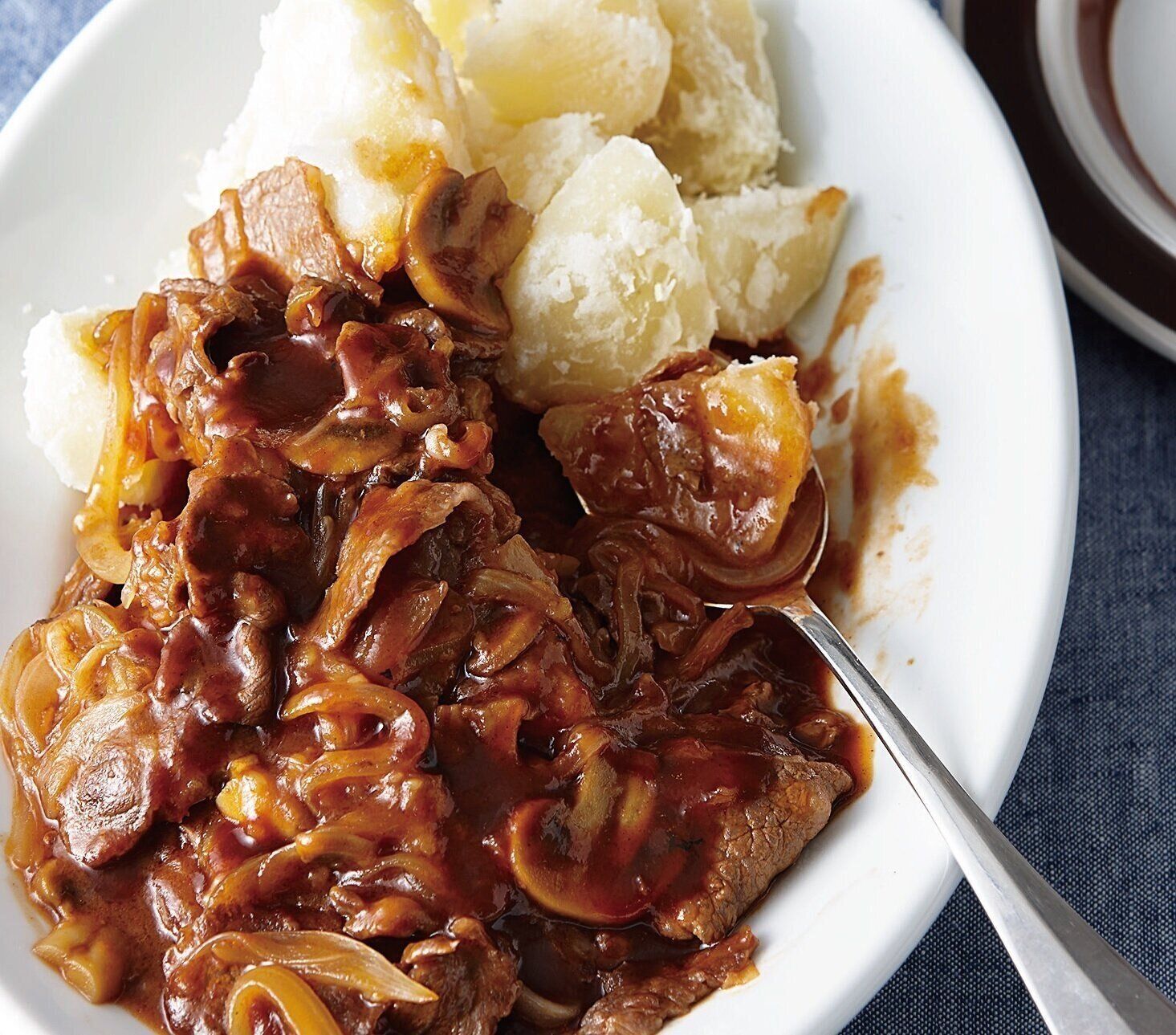 フライパンにバターを中火で熱して溶かし、玉ねぎを炒める。しんなりしたら牛肉、マッシュルームを加えてさらに炒め、牛肉の色が変わったら[A]を加えて煮立てて、とろみがつくまで煮つめる。(1)のじゃがいもにかける。