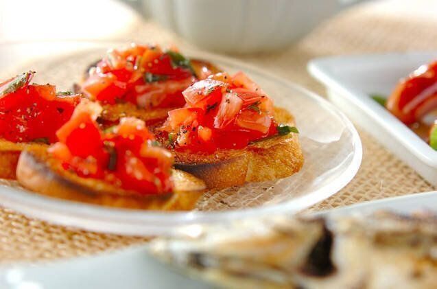 バジルとあえたトマトを、バゲットにたっぷりとのせたおつまみレシピ。片手でパクッと食べられるサイズ感と、華やかな見た目がパーティーシーンにぴったりですね。バゲットのカリカリ感、黒こしょうのスパイシーさがクセになる一品です。
