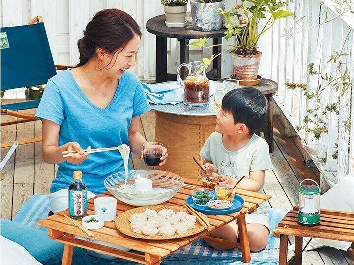 なかなか外出できないときは、おうちのベランダで気軽にアウトドア気分が味わえるベランピングはいかが。コーンやハム、青じそなど色とりどりのトッピングを用意して、そうめん流し器をセッティングすれば、家族が盛り上がるランチタイムの始まり始まり~!