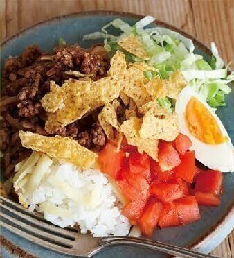 ホットプレートを保温にし、両端の空いている所に温かいご飯、トマト、レタスをのせ、ピザ用チーズをご飯にのせ、ゆで卵を並べる。各自で取り分け、あればトルティーヤチップスを割ってのせ、混ぜながら食べる。