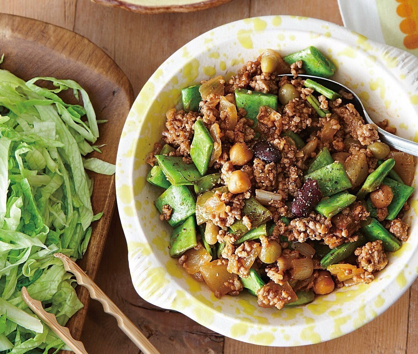 『サンキュ!』2021年7月号の「もりもりイケる夏のさっぱりおかず」よりモロッコいんげん入りチリビーンズレタス添えをご紹介します。