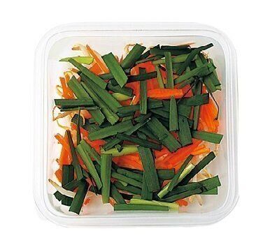 コンテナにもやしを入れ、にんじんとにらをのせる。
