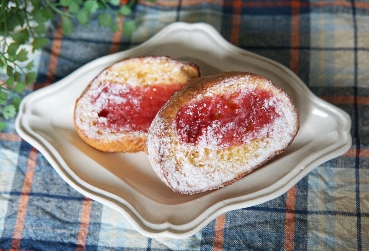 いちご風味のカステラ生地に、中まで淡いピンク色でいちご味のふわふわ生地が包まれています。袋を開けるとフワッと香るいちごフレーバー。ぼうしのふちにあたる部分がカリカリッとして砂糖の甘さが際立ち特に美味しかったです。ほのかないちご風味のメロンパンという感じの、素朴な味わいでした。