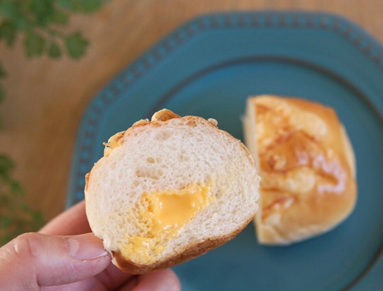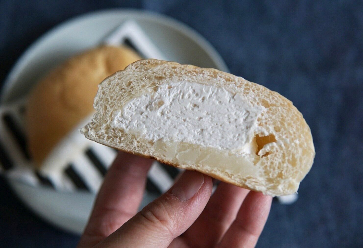 柔らかくてもっちりとした生クリーム配合の白パンにほどよい甘さのミルクホイップ。色が似ていてわかりづらいのですが、ホイップの下にはミルク味のお餅(求肥)が入っています。お餅が入ることでクリーム大福と錯覚してしまいそうな、名前通りのもちっともっちり食感を感じることが出来ます。