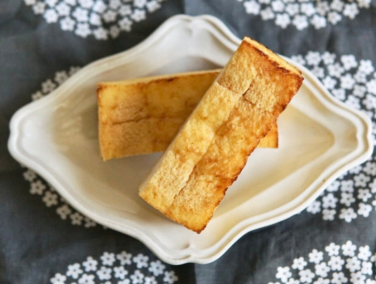 ごつそうにも見えるが、触ってみると柔らかくてふわふわしていることに驚く。カットしてみると空洞部分があり更に驚く。食べてみると、表面はサクリと中はもちっとしていて、でも軽い。新しい食べ物に出会った感覚です。レンジで少し温めてみると、ベビーカステラみたいな香りがして更に美味しく感じました。