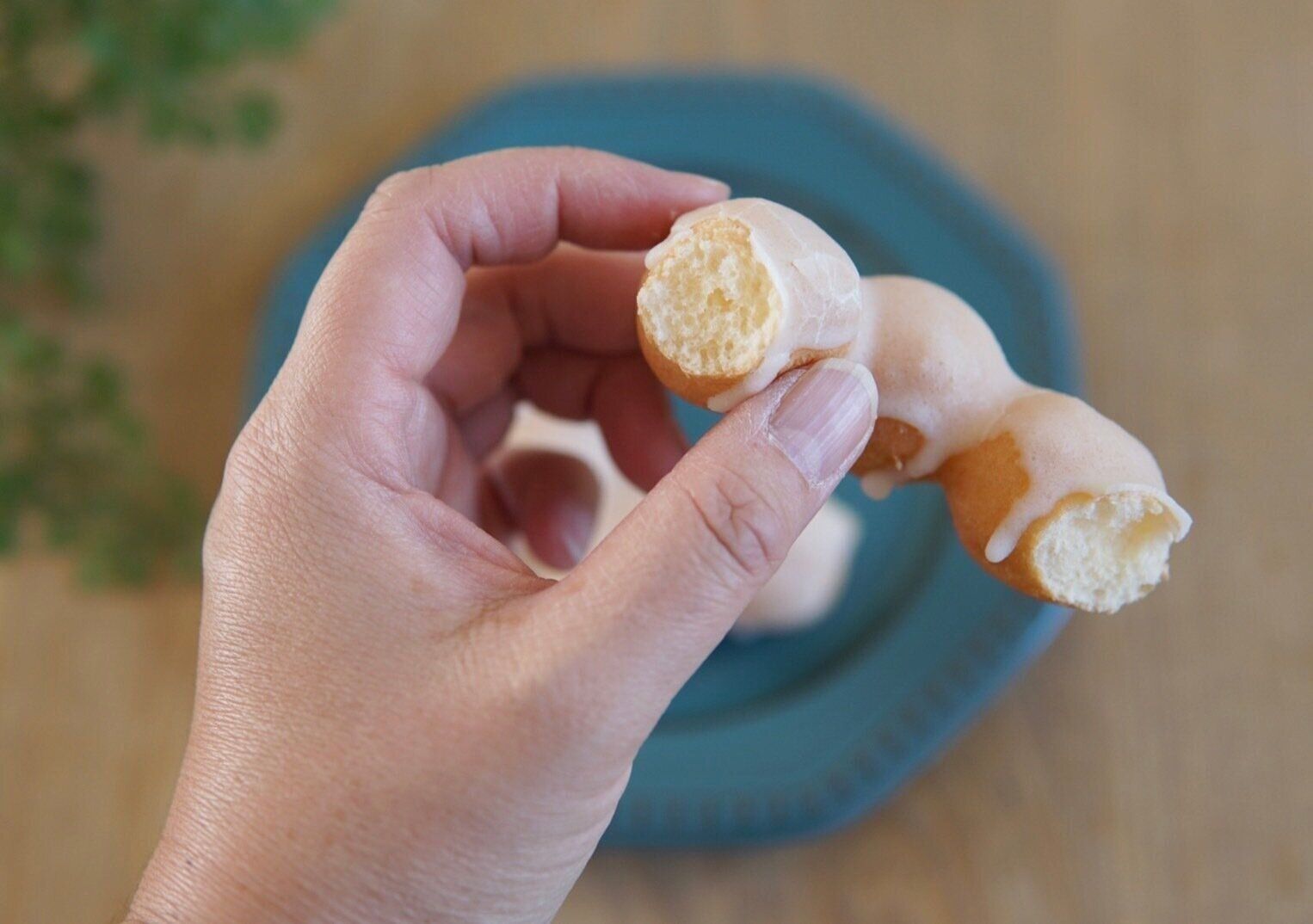 一見すると、濃くて重たそうな黒色、表面はシュガーグレイズでコーティングされています。一口いただいてみると、表面はザクッとしていますが中は思ったよりもしっとり食感。ドーナツ系でたまに遭遇する、癖のある油臭さはなく見た目よりも軽い感覚でいただけます。チョコ味も甘すぎずビターめ、シュガーグレイズが合わさることで、ちょうどいい甘さ加減に。リピートしたくなる美味しさです。
