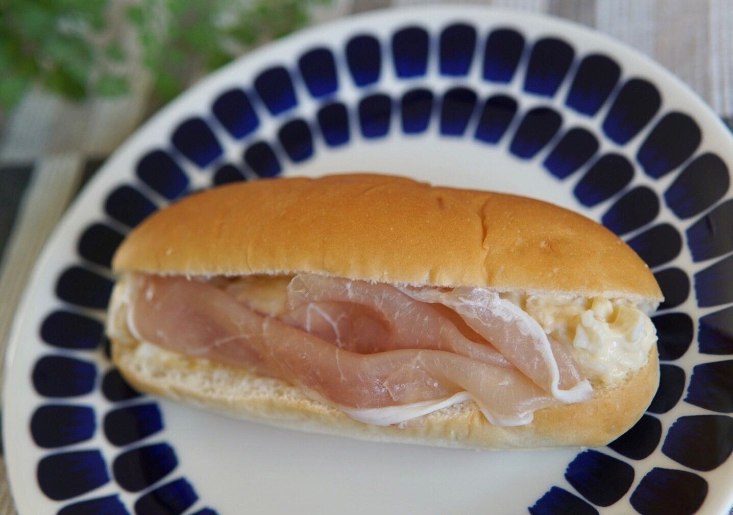 とにかく長くて、手で持ちながら引きで写真を撮るのに苦労しました。パンの長さを測ってみたところ29.5cmのまさにロングサイズ。でも、細いのでパクパクと食べ進められます。フランスパンは適度なもっちり感と噛み切りやすい柔らかさ。独特の風味が感じられました。ハムの塩気と粒マスタードのピリッとしたアクセントがたまりません。