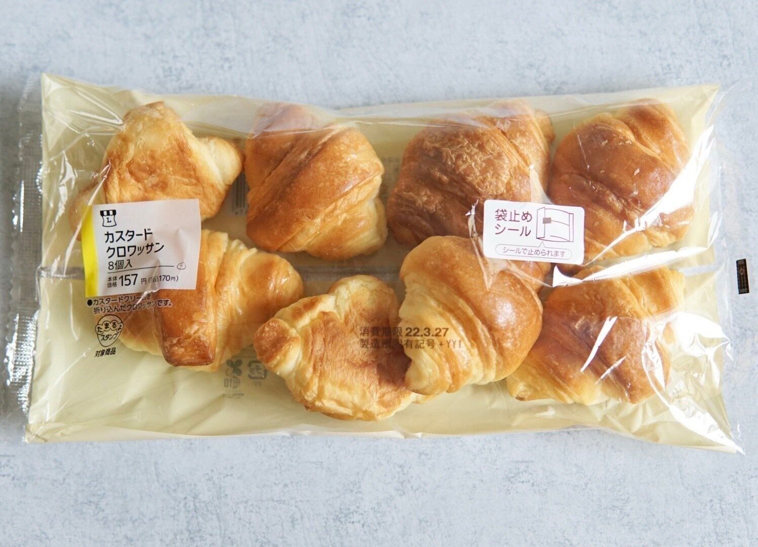 カスタードクロワッサンという名前ですが、カスタードが中に入っているのではなく、カスタードクリームを折り込んだクロワッサンで全体的にほどよい甘さが口の中に広がります。8個入りで税込み170円というコスパのよさと、次に食べる時用に袋止めシールが付属しているのが嬉しいです。