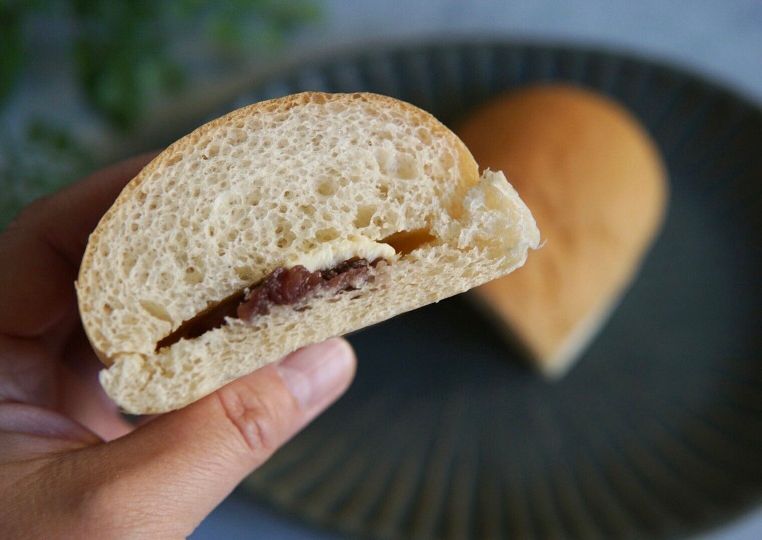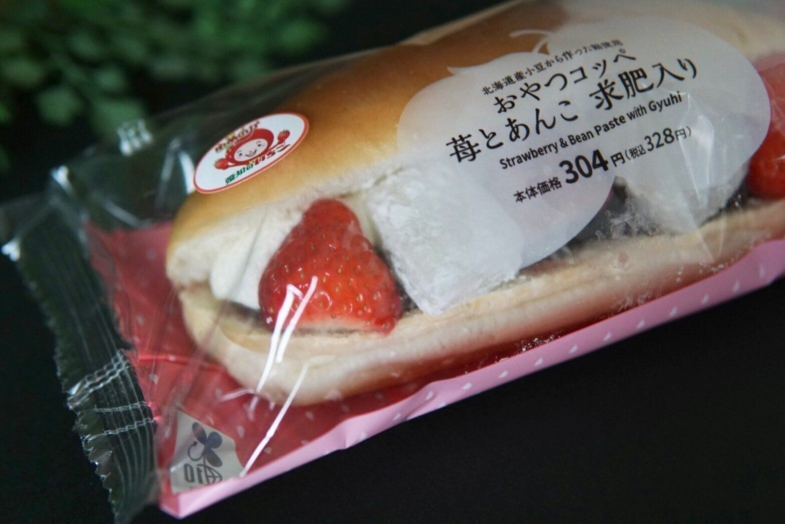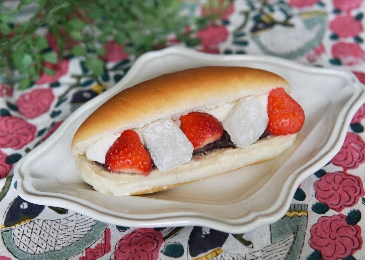 苺・もちもちの求肥・北海道産生クリーム・北海道産小豆から作ったあんこがコッペパンにサンドされています。求肥が入ることで、もちっとした食感があり、クリーム苺大福を挟んだかのような感覚に。苺も1/2カットされたものが3切れ入っており、フルーツの爽やかな酸味がプラスされています。