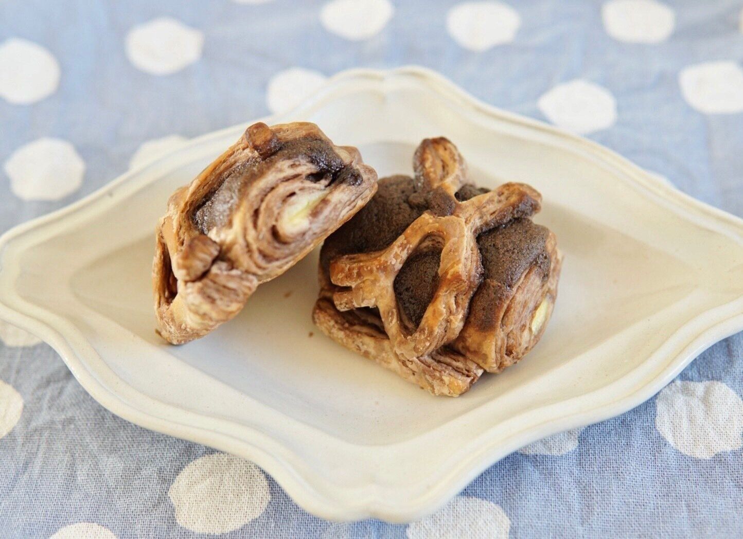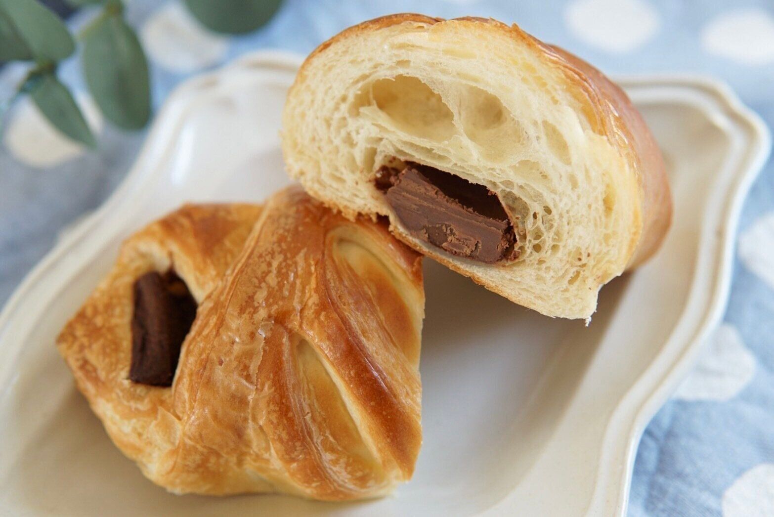 表面のデニッシュ生地のカットが独特、つやっとした表面も美しいです。ミルクチョコは板チョコの1.5倍くらいの厚みがあり、カリッとした歯ごたえが楽しめます。また、パンの端近くまでチョコがはみ出しているビジュアルも、チョコ好きにはたまらないポイントです。