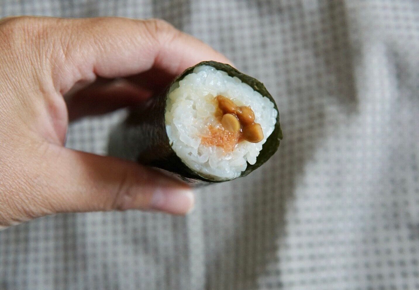 極小粒納豆を使用した定番の納豆巻に、ピリッと辛い明太子が添えられています。