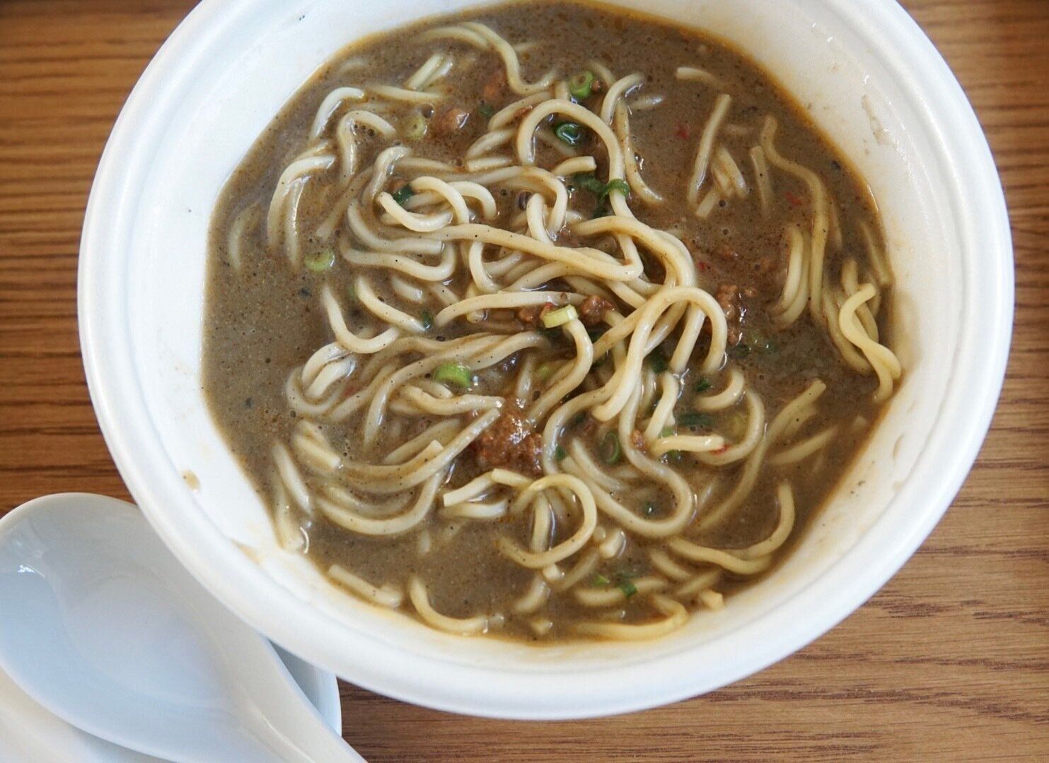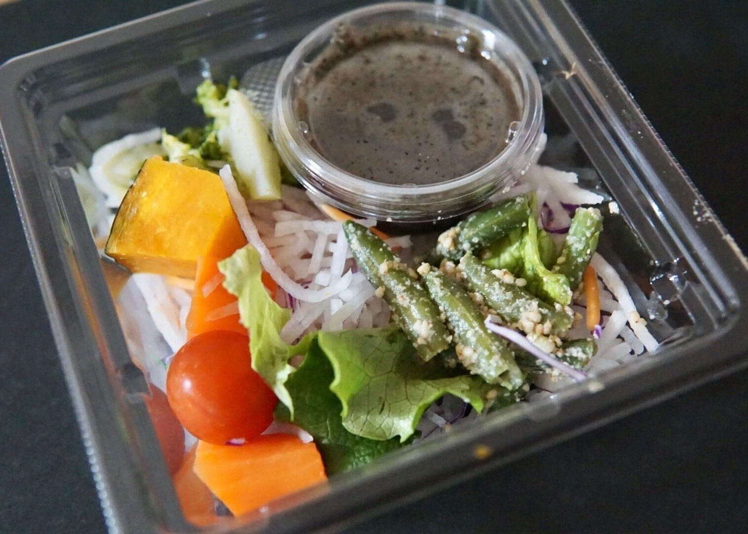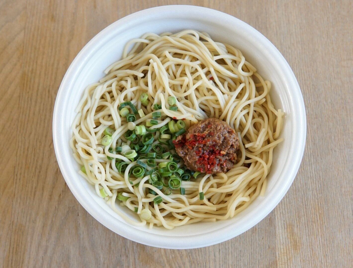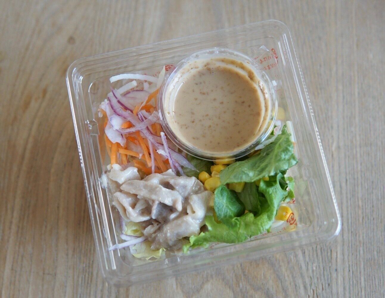 麺も野菜も肉もすべて入っているのが嬉しいです。野菜がシャキシャキで新鮮、麺も固まることなくつるつると、胡麻ポン酢ドレッシングの味もしっかりしていて最後まで美味しくいただけます。この時期にありがちな、急に気温があがってさっぱり系の食事がしたいときにもおススメです。