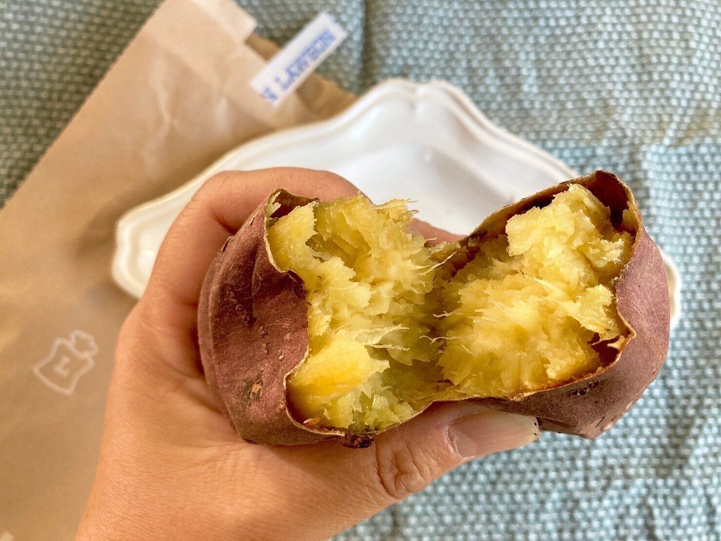 なめらかな舌触りと甘みが特長の国産「紅はるか」を使用。甘みを引き立たせるため熟成させたサツマイモを専用オーブンで焼き上げています。熱くなっているので触らないでくださいという注意書きがあり、店員さんに取ってもらうスタイルです。しっとりねっとりとした食感で甘さも抜群、何度でもリピートしたくなる味です。