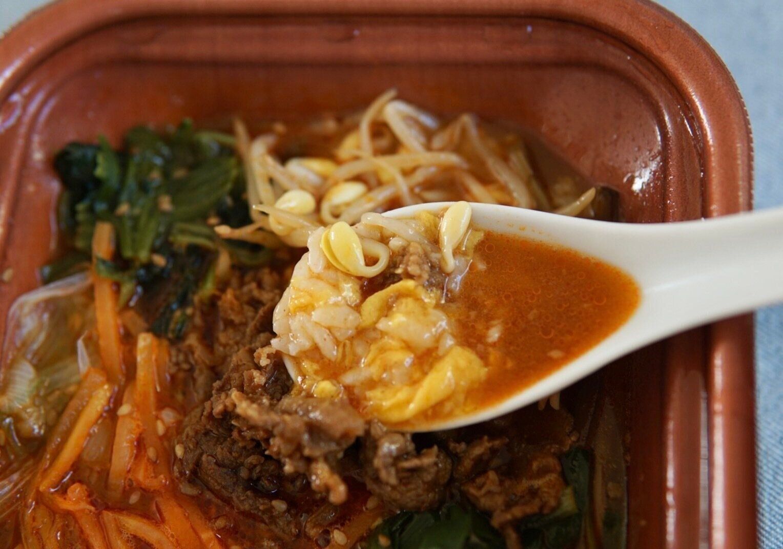 温かくないごはんに牛肉の脂って気にならないのかなと思いつつ購入しましたが、全然気になりませんでした。柔らかいお肉のすき焼きに卵黄ソースのとろみがからんで一体となり、味のアクセントに加えられた柚子入り七味唐辛子がピリッと味に奥行を与えてくれておいしいです。