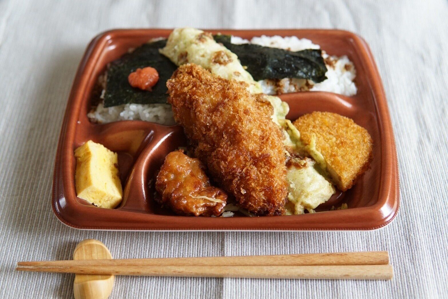 白身フライにちくわ磯部揚げ、唐揚げにコロッケ、きんぴらごぼうと卵焼きも。のりの下には味のついたおかか、上には明太子。お弁当にあると嬉しいものオールスターがしっかりと揃った食べていて嬉しくなるお弁当です。タルタルソースと減塩醤油も別添されているのが、また嬉しいです。