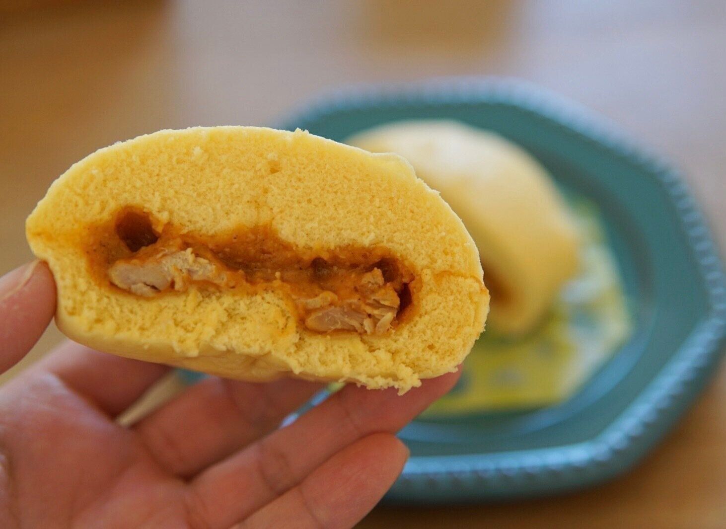 バターの香りとまろやかな乳感、コクのある味わいのバターチキンカレーがカレーまんならではの黄色い生地に包まれています。いつも食べているカレーまんとはまた違った、まろやかながらスパイシーな辛みも味わえるのが特徴です。割ってみると、チキンもしっかり入っているのが確認できます。価格もお手頃なのが嬉しいです。