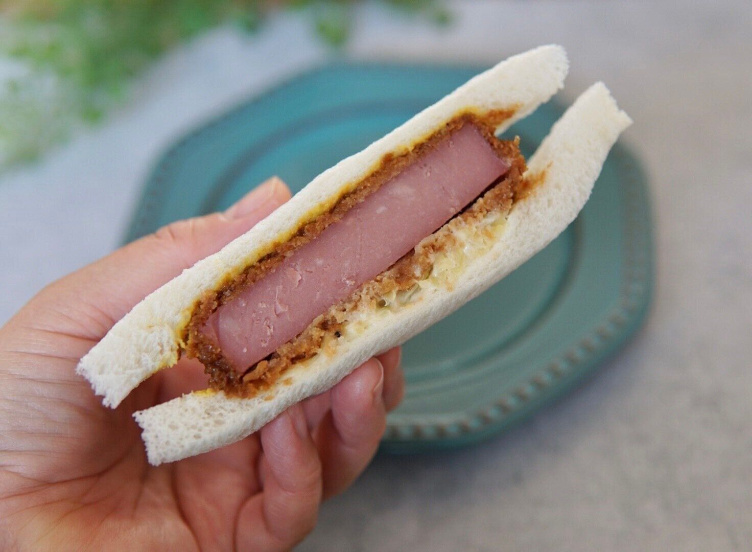 - とにかく厚くてジューシー「三元豚の厚切りロースカツサンド(とんかつ まい泉監修ソース使用)」