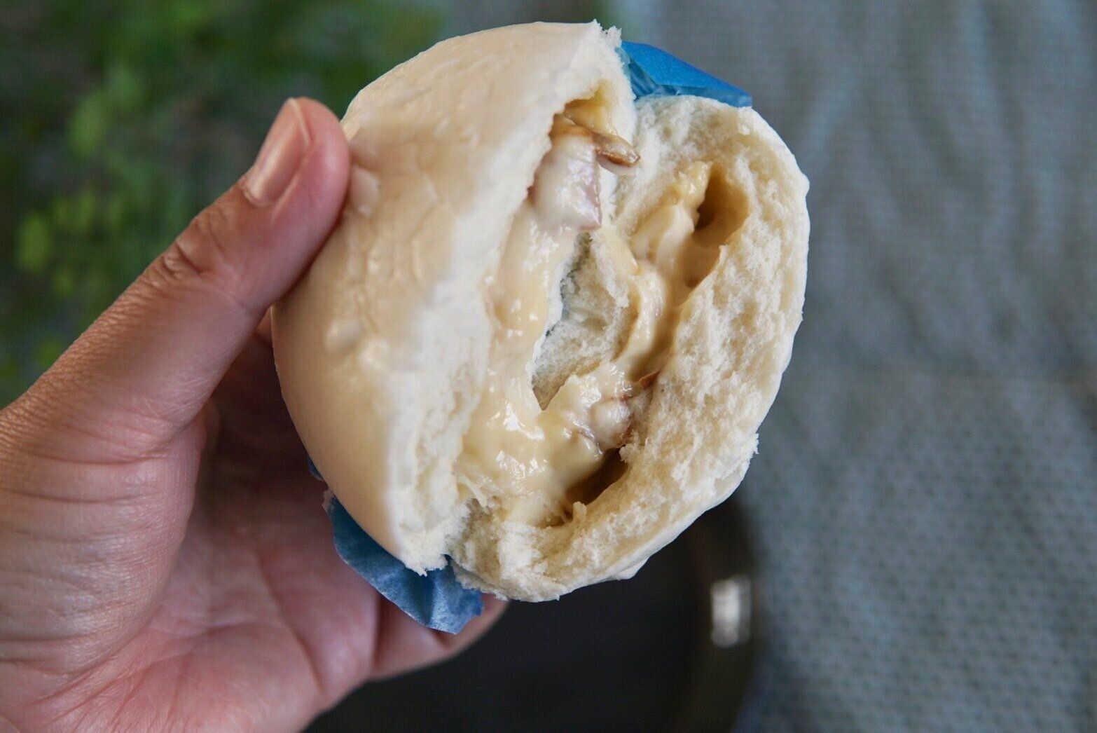 割って見ると、とろっとしたチーズとゴロッとしたベーコンがこんにちは。スモーク調理の代表格、チーズとベーコンの組み合わせがあわないはずがありません。グラタンみたいなマイルド味を想像していましたが、想像以上にスモークの香りが強く、ワインに合いそうな大人向けの中華まんだなと感じました。