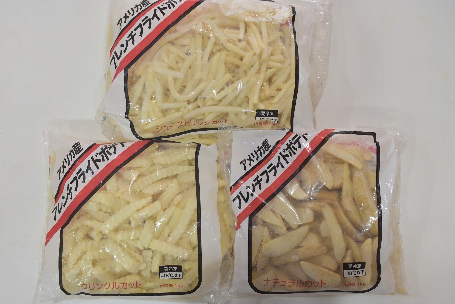 今回は業務スーパーで販売されている「アメリカ産 フレンチフライドポテト」3種の食べ比べをお届けします。商品名はいずれも「アメリカ産 フレンチフライドポテト」ですが、パッケージ左下に形状が書かれており、そちらは以下のとおりとなっています。