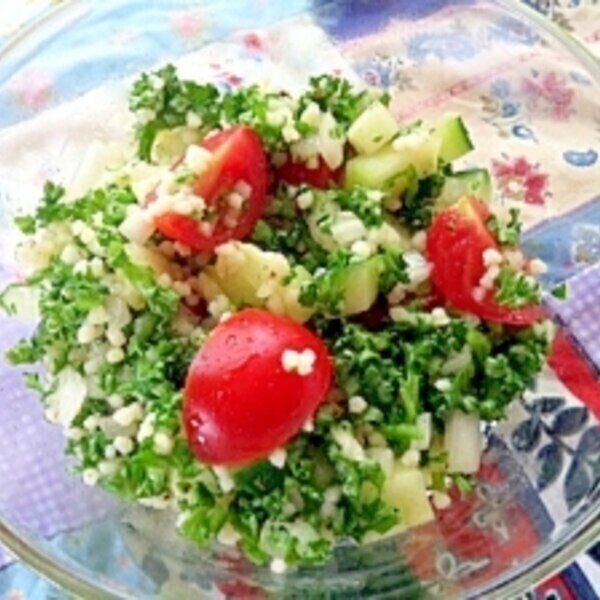 たっぷり使ったパセリとクスクスが入っているのが特徴の中東風サラダです。シンプルな味付けで素材の美味しさを楽しめます。レモン汁を加えるのでさっぱり食べられます。