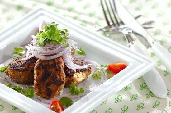 家庭でもお手軽にケバブ風の味付けが楽しめる、スパイスが効いたハンバーグです。上に乗せたパクチーと紫玉ねぎで、爽やかさも彩りもアップ!