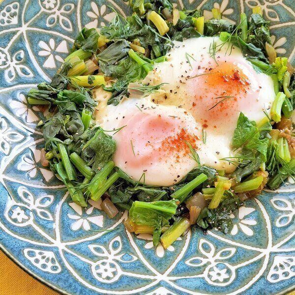 炒めたほうれん草と玉ねぎの上に卵を落としたイラン料理。身近な材料で作れますが、味付けに使うスパイスで味わいは本格派。野菜と卵で栄養もたっぷり、朝ごはんにも良さそうです。