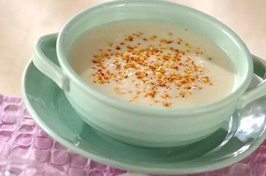 炒めたじゃがいもと玉ねぎをミキサーにかけて作る、牛乳ベースのとろみがあるスープです。クスクスも入って食べ応え抜群の一品です。最後に加えるフライドオニオンで風味もアップ!
