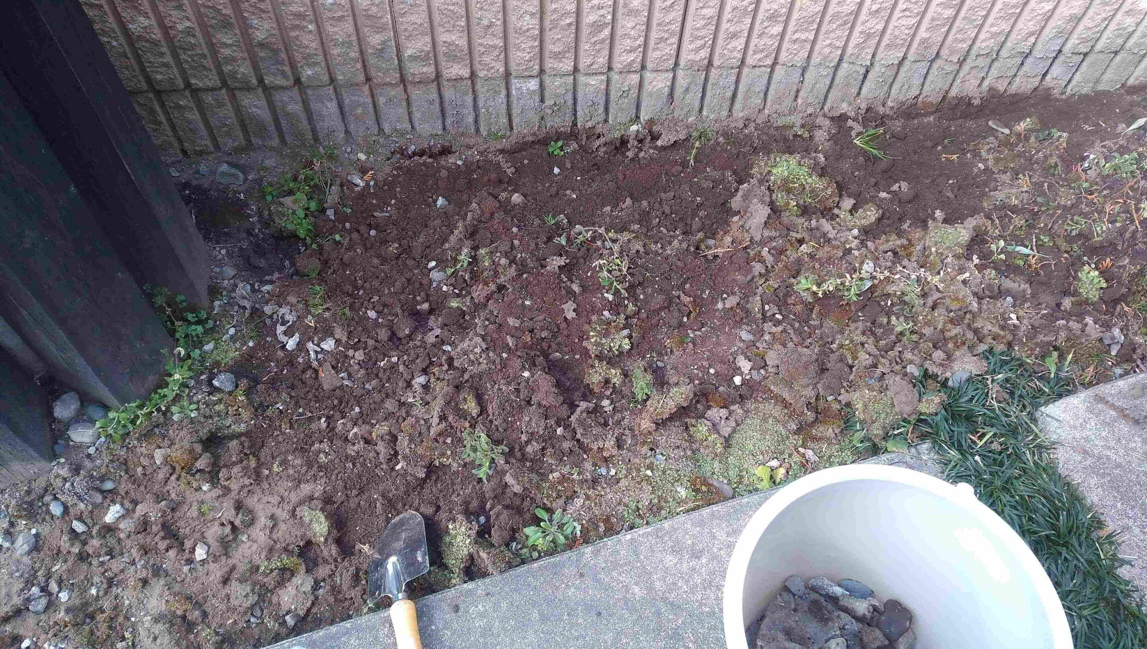 ほぼ雑草はなくなり、土に混ざっていた大き目の石等も取り除きます。取り除けたら足で踏んだりして平らに整地します。