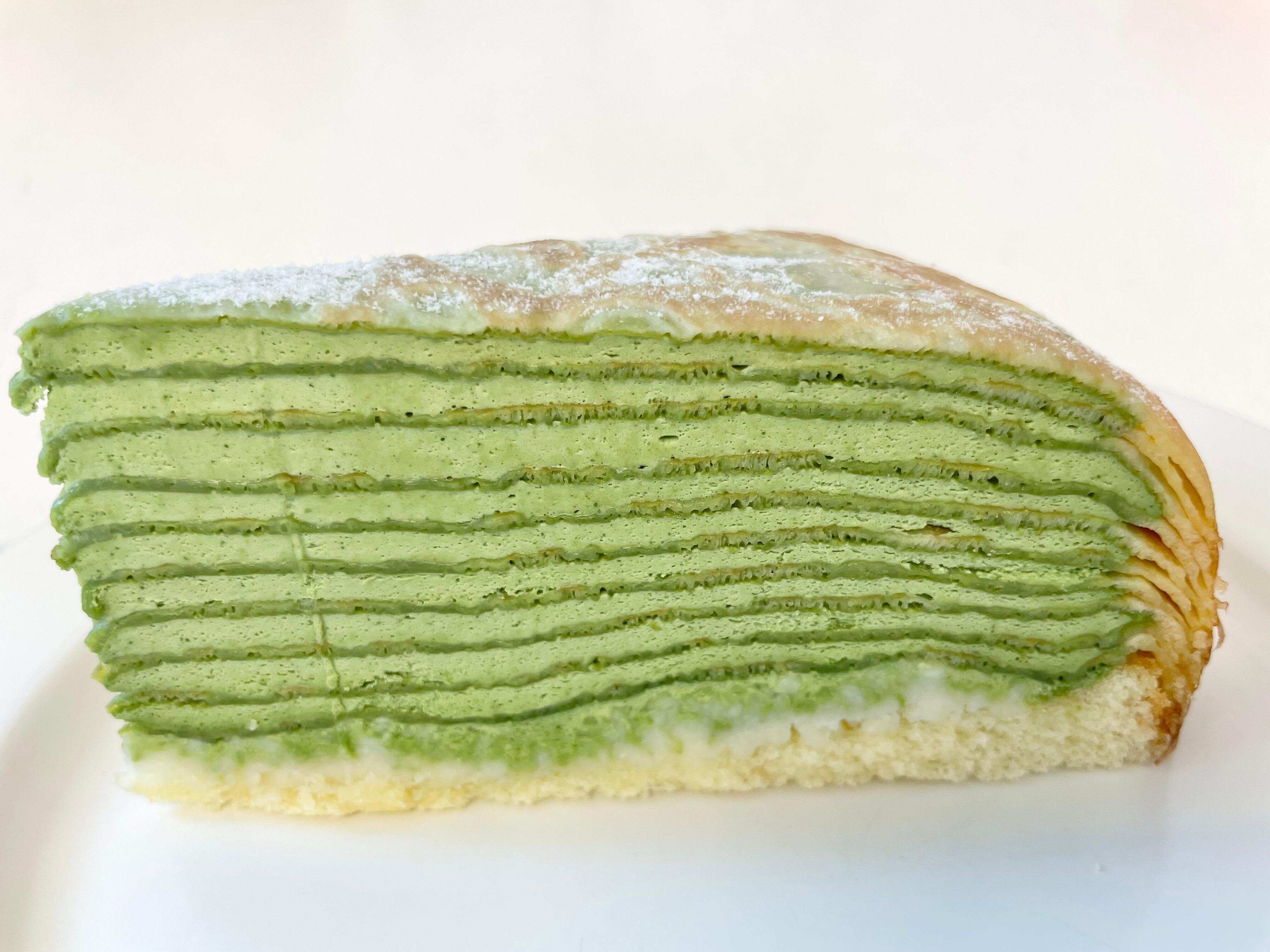 お抹茶ミルクレープは、抹茶クリームとバターを使用したくちどけのよいクレープを10層重ね、抹茶クリームがサンドされています。