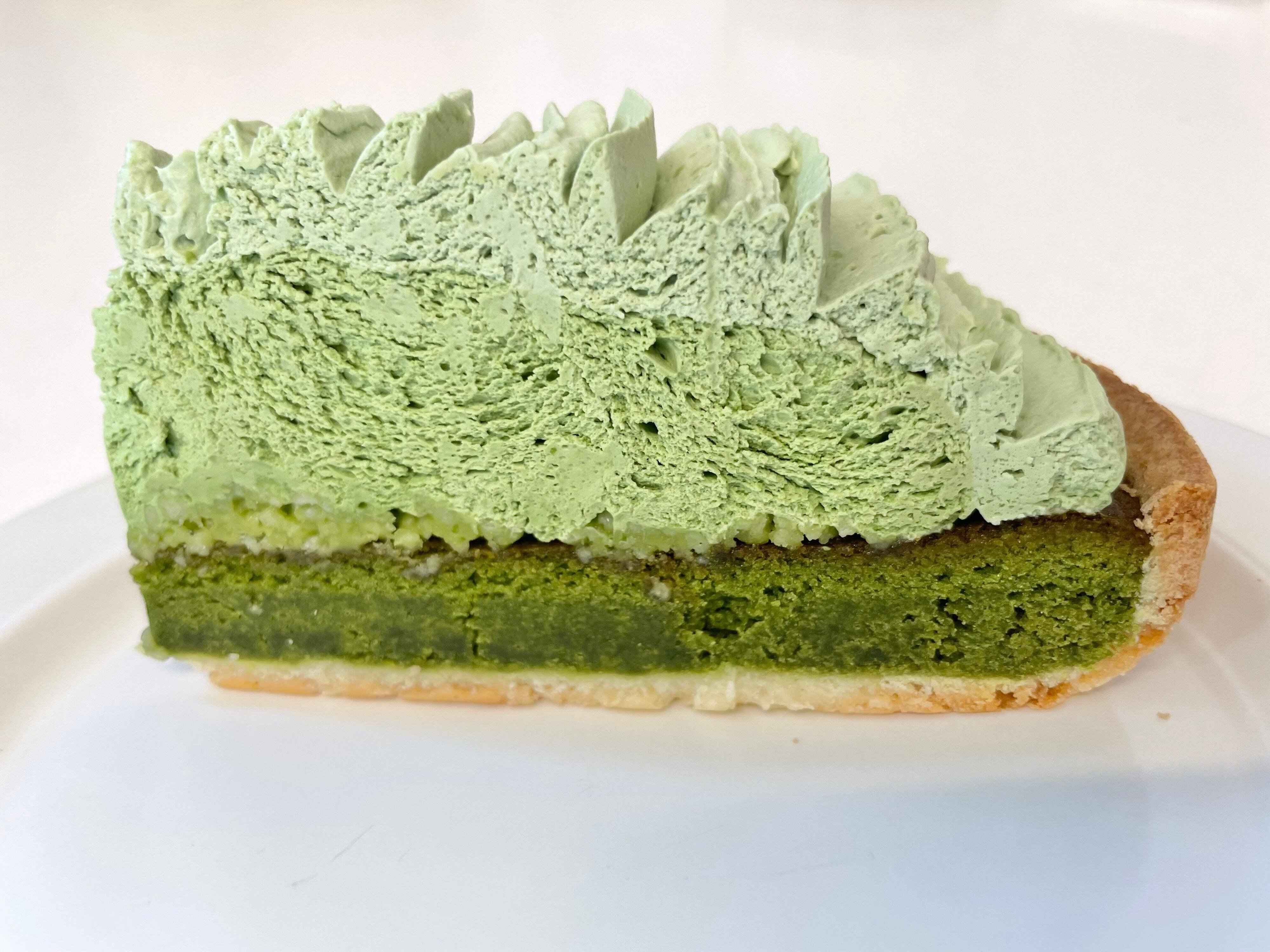 抹茶タルトは、しっとりとしたタルト生地に抹茶のダマンド生地、フレーク、2種類の抹茶クリームがのっています。