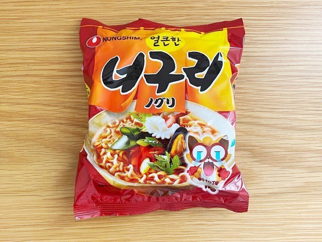 貝やいかなどからとった海鮮エキスに唐辛子、にんにくを合わせた海鮮うどん風のラーメンです。ノグリは韓国語で狸という意味で、丸くて太い麺の形が狸を連想させるということで名付けられたブランド名なんだそう。