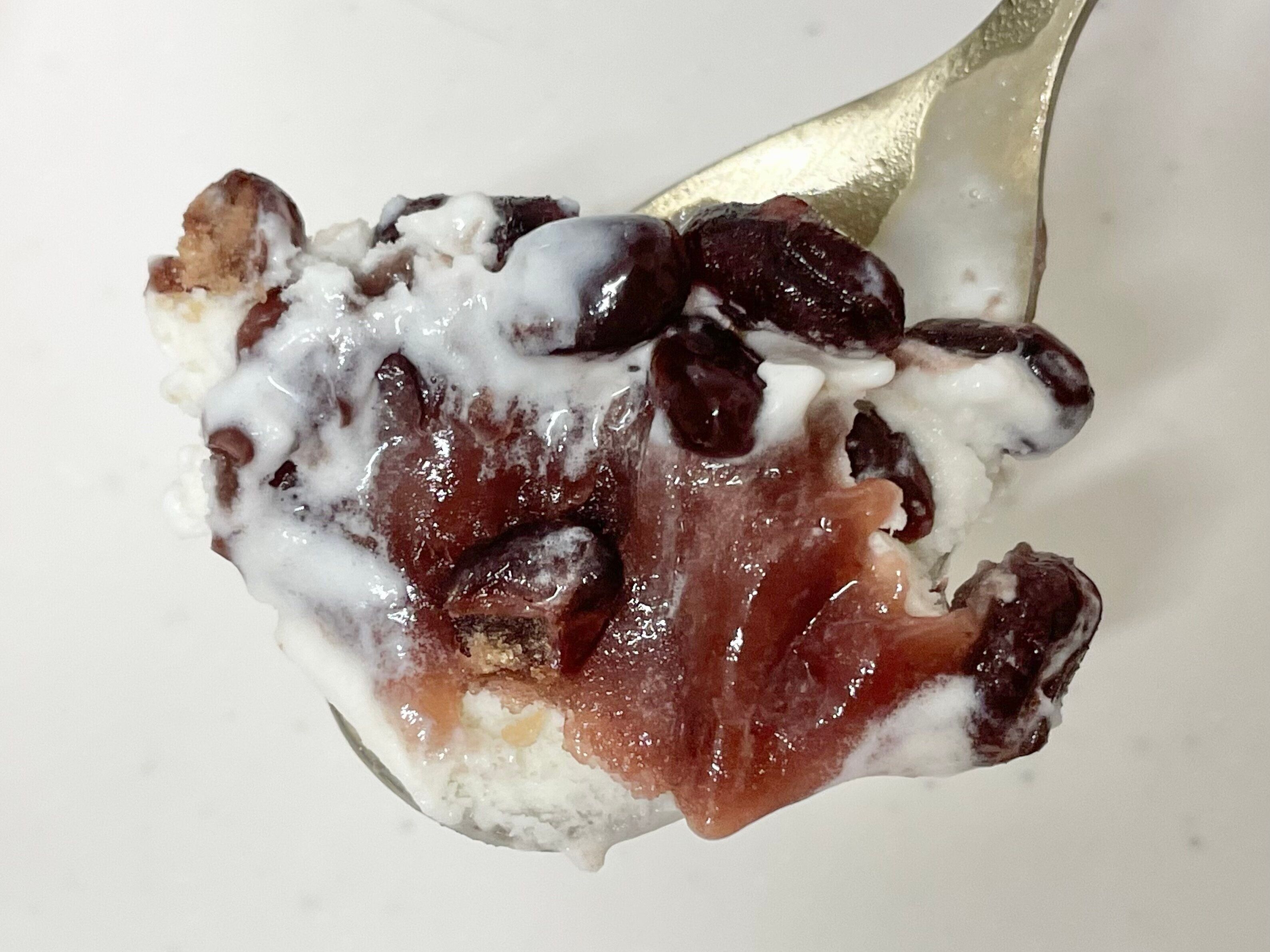 冷凍庫からすぐに出して食べましたが、スプーンがスッと入るやわらかさです。バニラアイスはとろりとしたくちあたり、ミルキーでコク深く、濃厚なんだけど後味がすっきりしています。つぶあんはほんのり塩気が効いていて、ミルクの甘みを引き立てています。