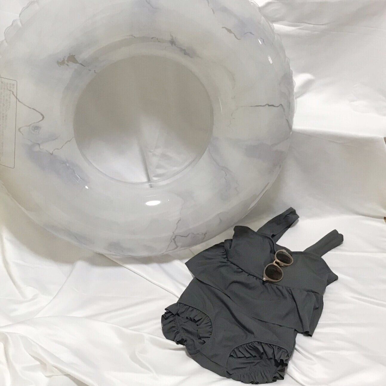 「マーブル柄浮き輪」(330円)はシックな大理石柄の浮き輪。年齢問わず使いやすい大人っぽい柄の浮き輪が330円とプチプライスで購入できます。カラーはグレーとブルーの2色展開。筆者はグレーを購入しました。