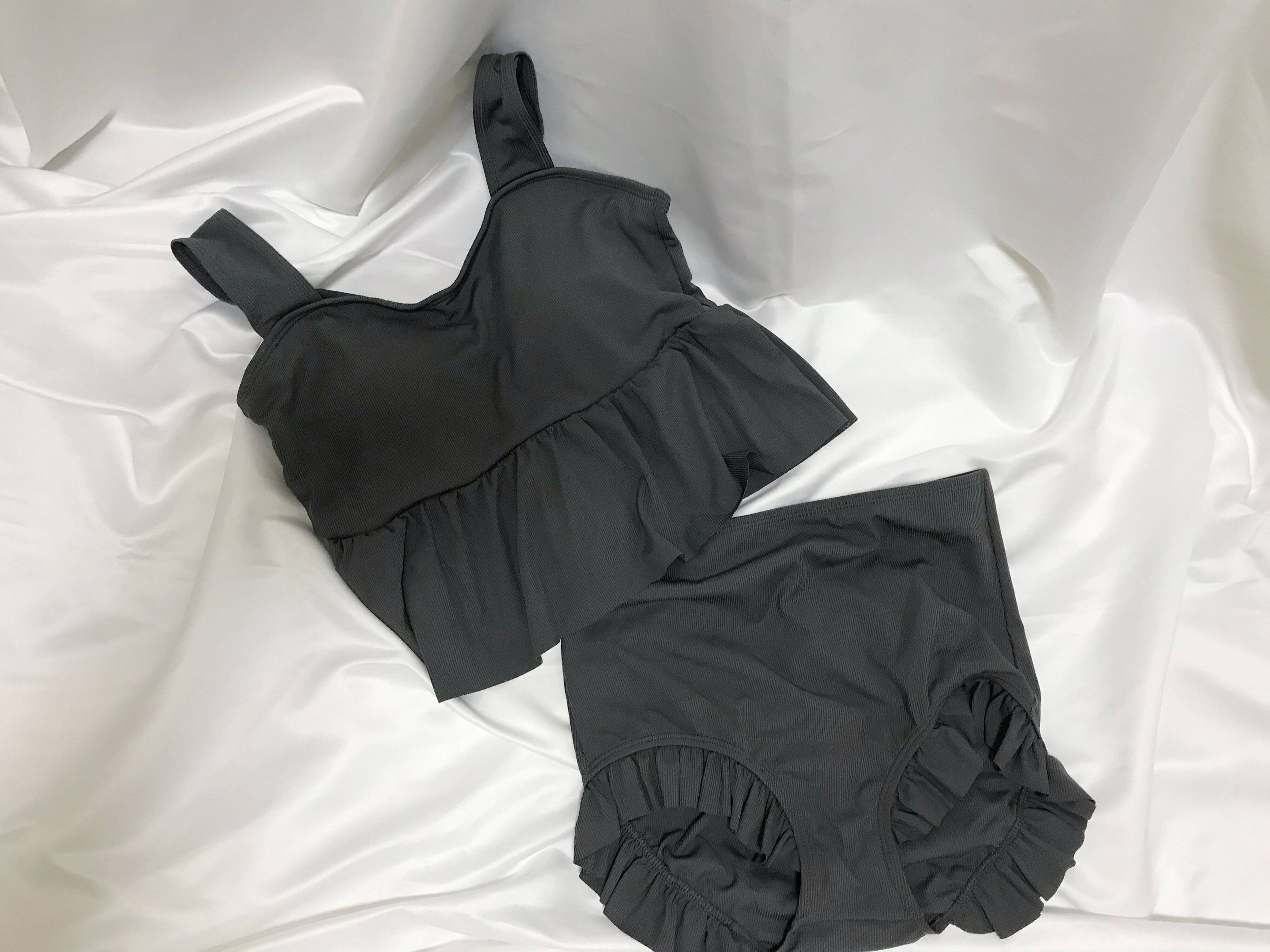 フリルが施されているかわいらしいデザインですが、カラーがグレーなので大人っぽい印象の水着です。セパレートタイプですが、フリルがおなか回りを隠してくれるので露出も少なめです。