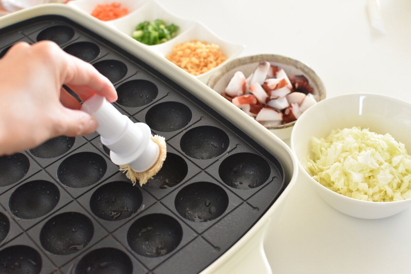 たこ焼きプレートの底にたまるぐらいのサラダ油を入れることでカリッとした食感になります。