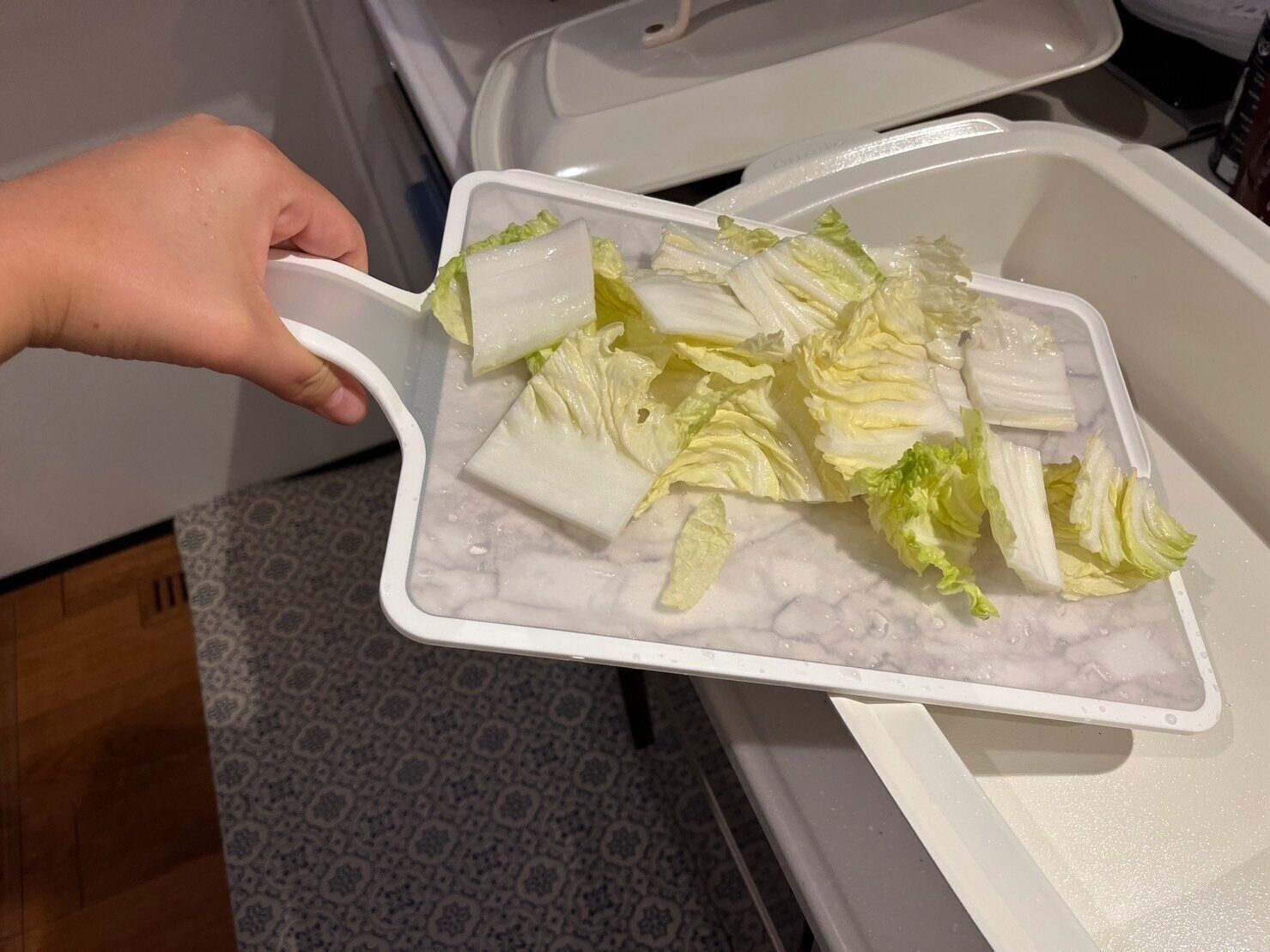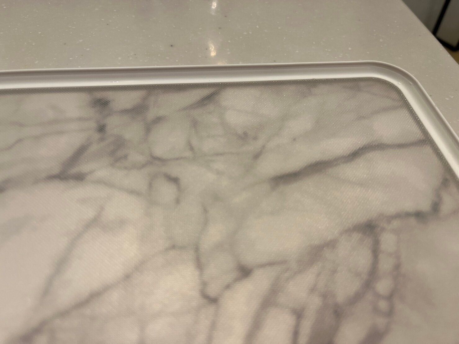 大理石調のおしゃれなまな板ですが、なんと取っ手が付いているんです。