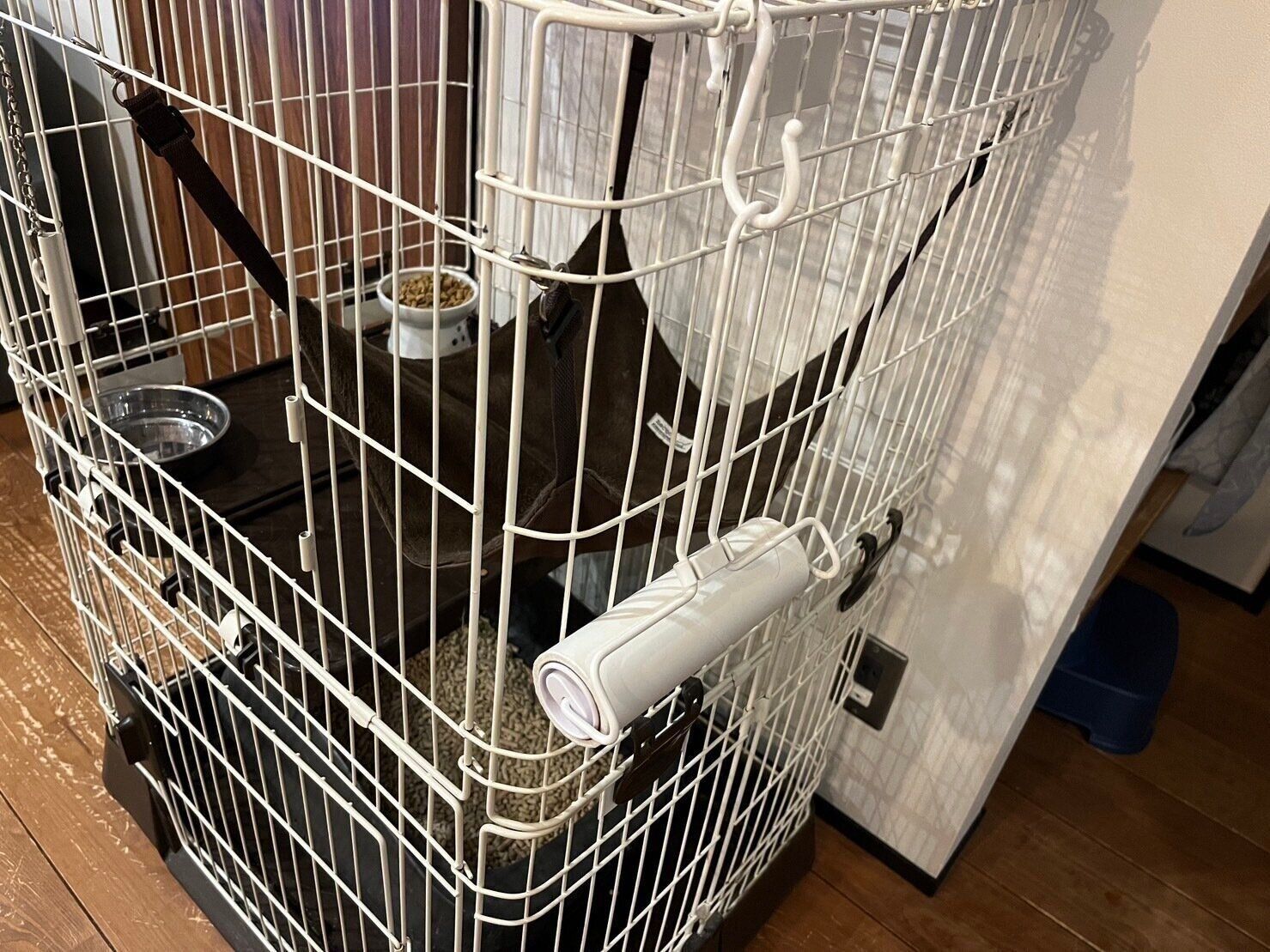 洋服などについた猫の毛をすぐに取ることができるよう、猫のケージにフックで引っ掛けています。