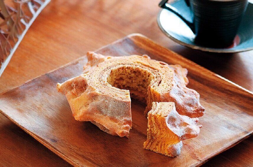高級卵「宝山」を使用。一本一本丁寧に直火焼きされた、バームクーヘン専門店の逸品。発酵バターとアーモンドの豊かな風味と、キャラメルのような香ばしい新食感がやみつきに!