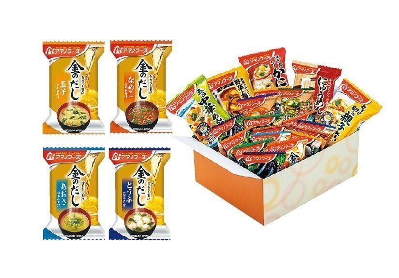 〔内容〕みそ汁(定番と減塩の2タイプ×4種類×各1食)、金のだし(4種類×各1食)、スープ、雑炊、にゅうめん、カレー(各1食)、総菜、Theうまみ(各2種類×各1食)