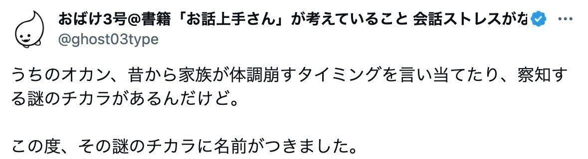 おばけ3号@書籍「お話上手さん」が考えていること 会話ストレスがなくなる10のコツ発売中さん(@ghost03type)が投稿したのは、母と交わしたメッセージ。家族の体調不良を察する母の勘につけられた、センス抜群の名前が話題になりました。