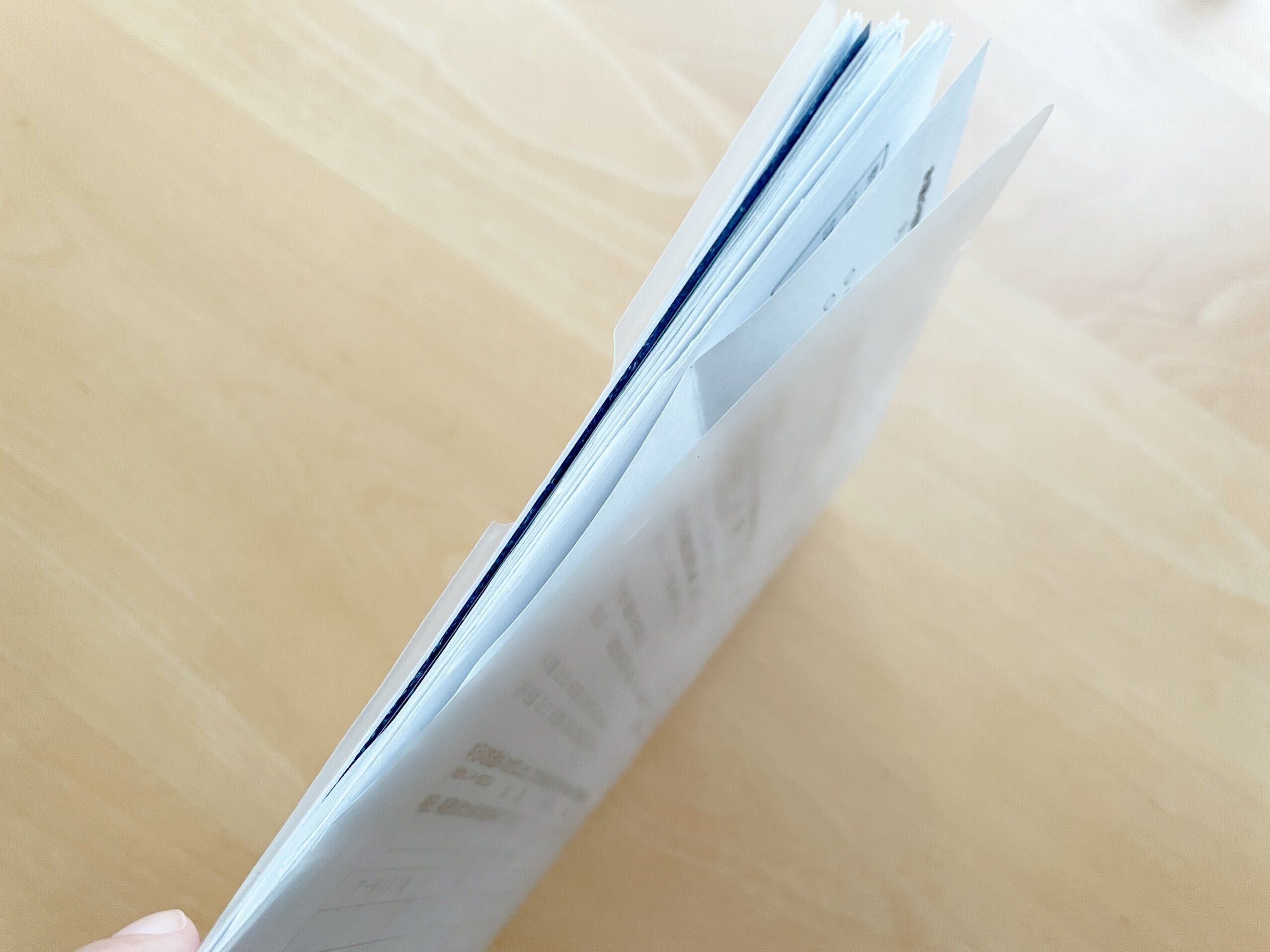 我が家の双子はズボラなので、クリアポケットタイプのファイルは出し入れが面倒で出しっぱなしや入れっぱなしになる可能性が大と判断してやめました。じゃばらタイプのファイルケースは持ち運びには不便かつ分類が多すぎると探すのも面倒ということで、使うことにしたのが無印良品のスリムポケットホルダーです。