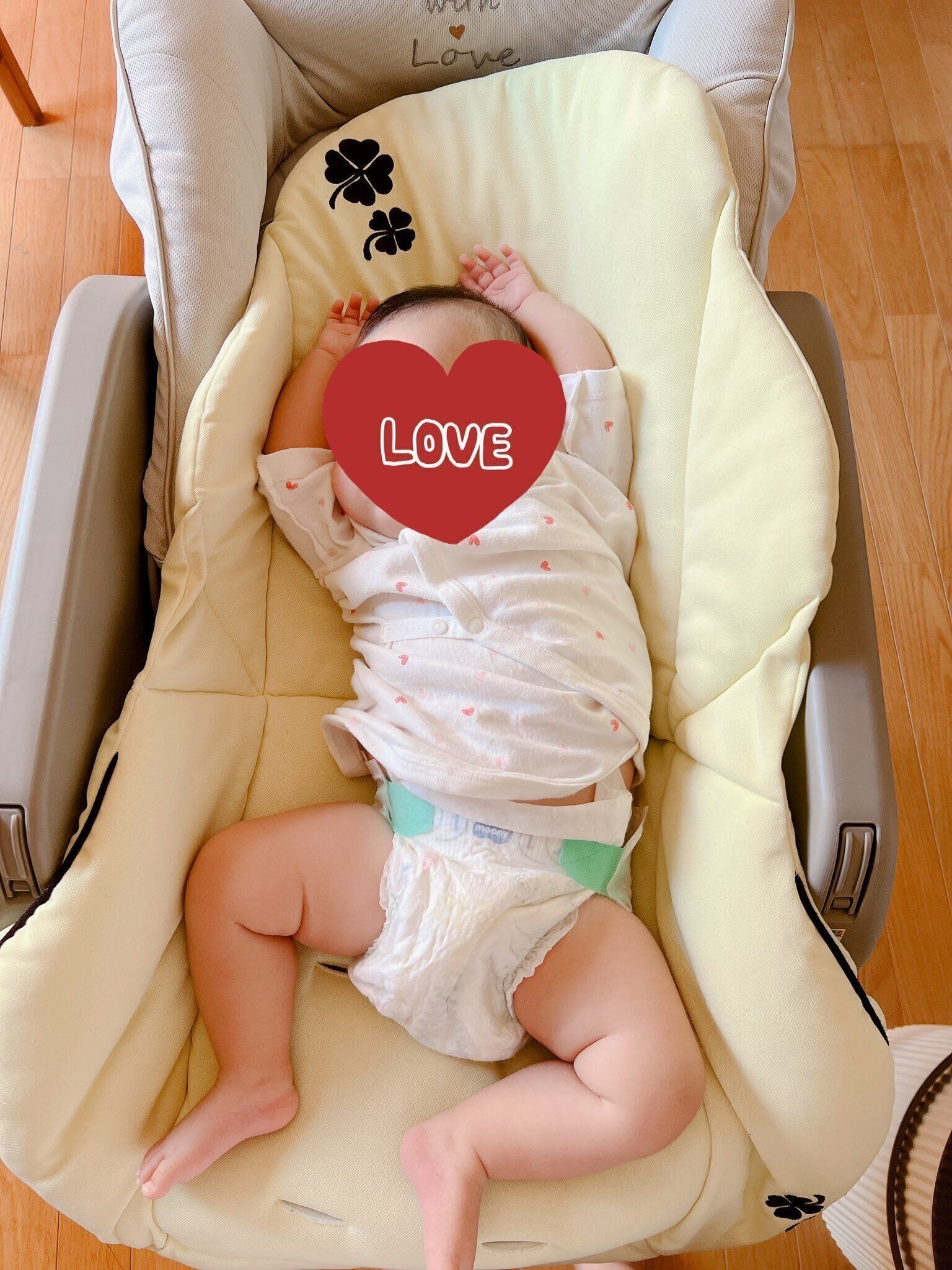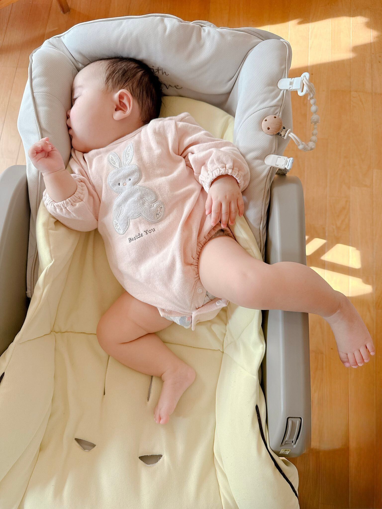 ハイローチェアにちょこんと収まり、お行儀良く眠っています。
