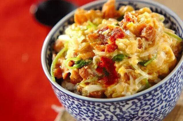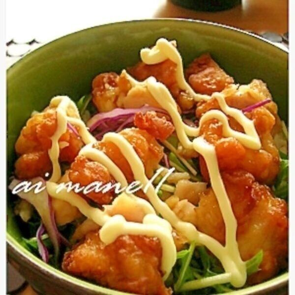 残り物の唐揚げを使って、あっという間に完成。定番の唐揚げも、丼にすることで新鮮な印象に。唐揚げにかけたタレは麺つゆと砂糖で簡単に作れます。野菜が一緒に食べられるのもうれしいですね。最後にかけるマヨネーズがポイント!
