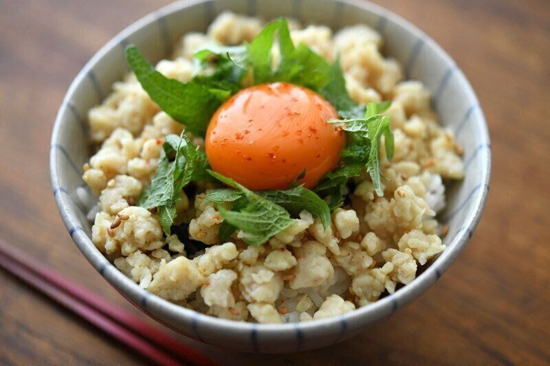 鶏胸肉で作った、ヘルシーでやみつき感のある塩そぼろを使ったレシピです。海苔、大葉、一味唐辛子で満足感もアップ!お好みの薬味にアレンジしても楽しめそうです。お弁当にする場合は卵黄を目玉焼きや炒り卵に変更してもおいしいです。